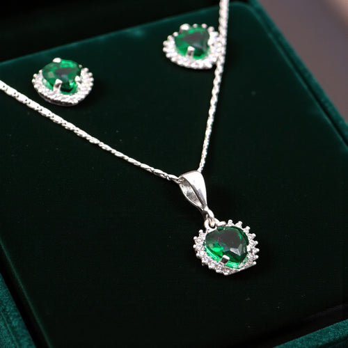 Aretes + Cadena + Dije Corazón Verde en Plata .925