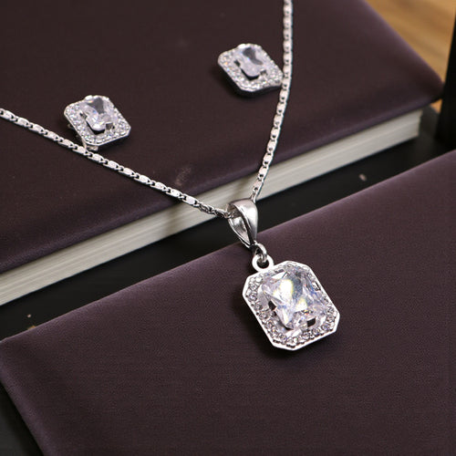 Aretes + Cadena + Dije Cuadro Blanco en Plata .925
