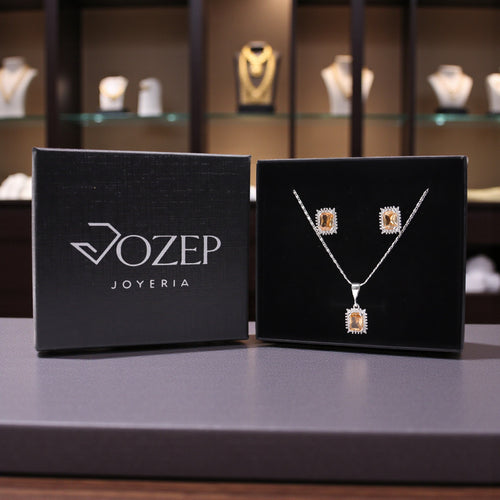 Aretes + Cadena + Dije Cuadro Naranja en Plata .925
